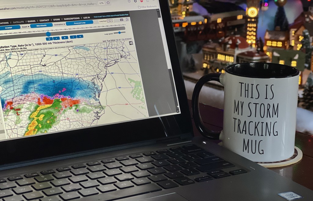2024 may be going out with a bang regardless of your New Year’s Eve plans as a strong cold front crosses the area this evening. Expect a line of showers and possible thunderstorms from about 5 to 8PM from west to east. After the frontal passage, gusty winds and seasonably cooler temperatures for tomorrow, New Year’s Day. Then, a cold air mass settles in and, as far as temperatures are concerned, we may be in for the best stretch of winter weather in several years. Models have been advertising a prolonged stretch of cold lasting at least into the second half of January. Even better, normal to even above normal precipitation is expected. Whether that translates to snow is still to be determined, but models are already starting to focus on a few threats.